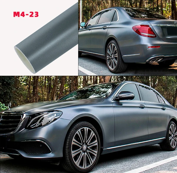 Satin metallic charcoal grey car wrap with high flexibility and weather resistance.